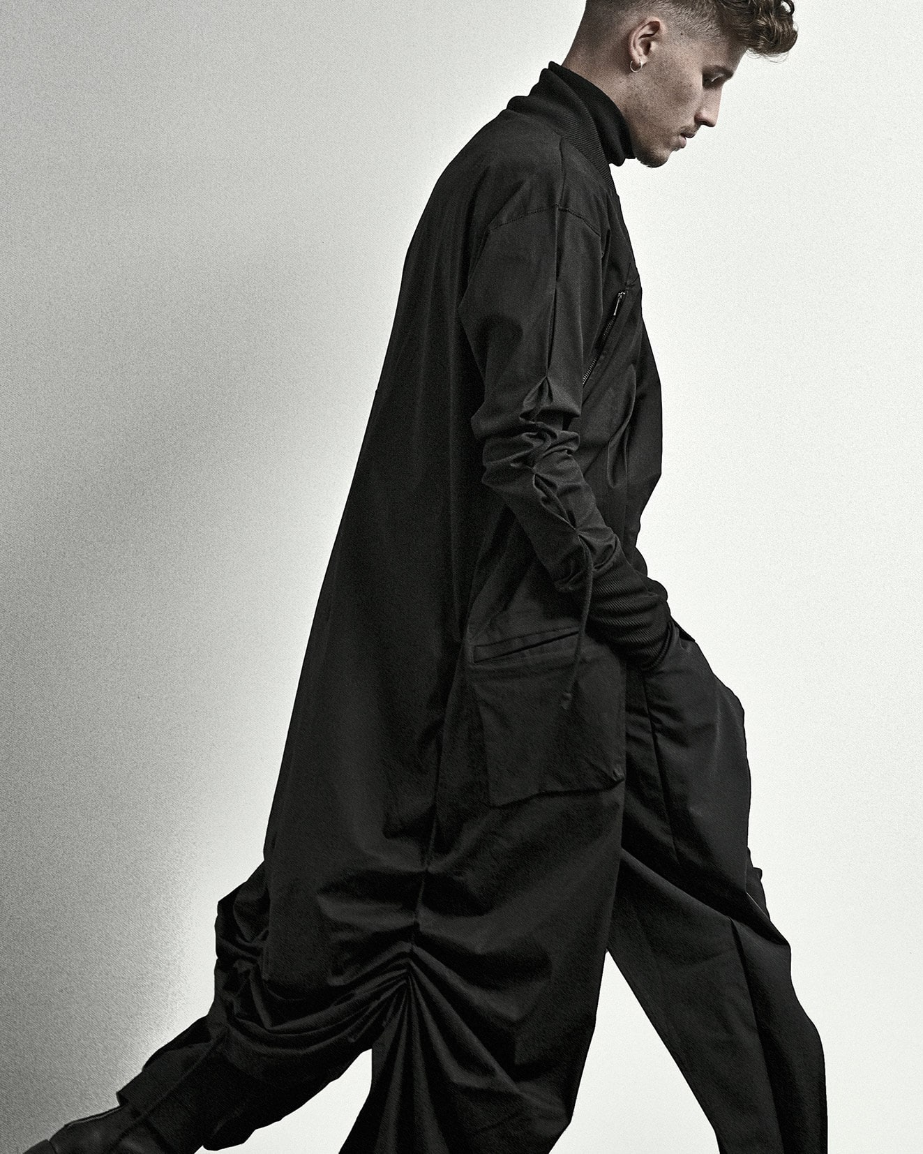 CHANGING PERCEPTIONSStyling a distinctive garment such as the 'Modus' Overlong Cargo Bomber Jacket through multiple rope fastening adjustments. A garment from collection 'Structure' with the idea to alter the silhouette perception.