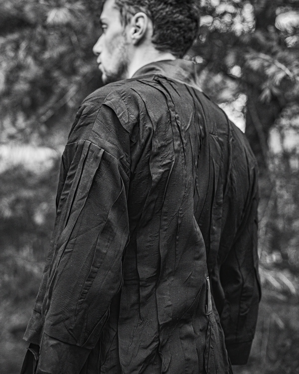 The last garment in this article is the Linear Crushed Technique Long Kimono Coat from collection ‘Entanglement’. This design features loose elongated silhouette in combination with the signature ‘Crushed’ technique linear texture.The coat has two front diagonal cut pockets and single internal pocket.