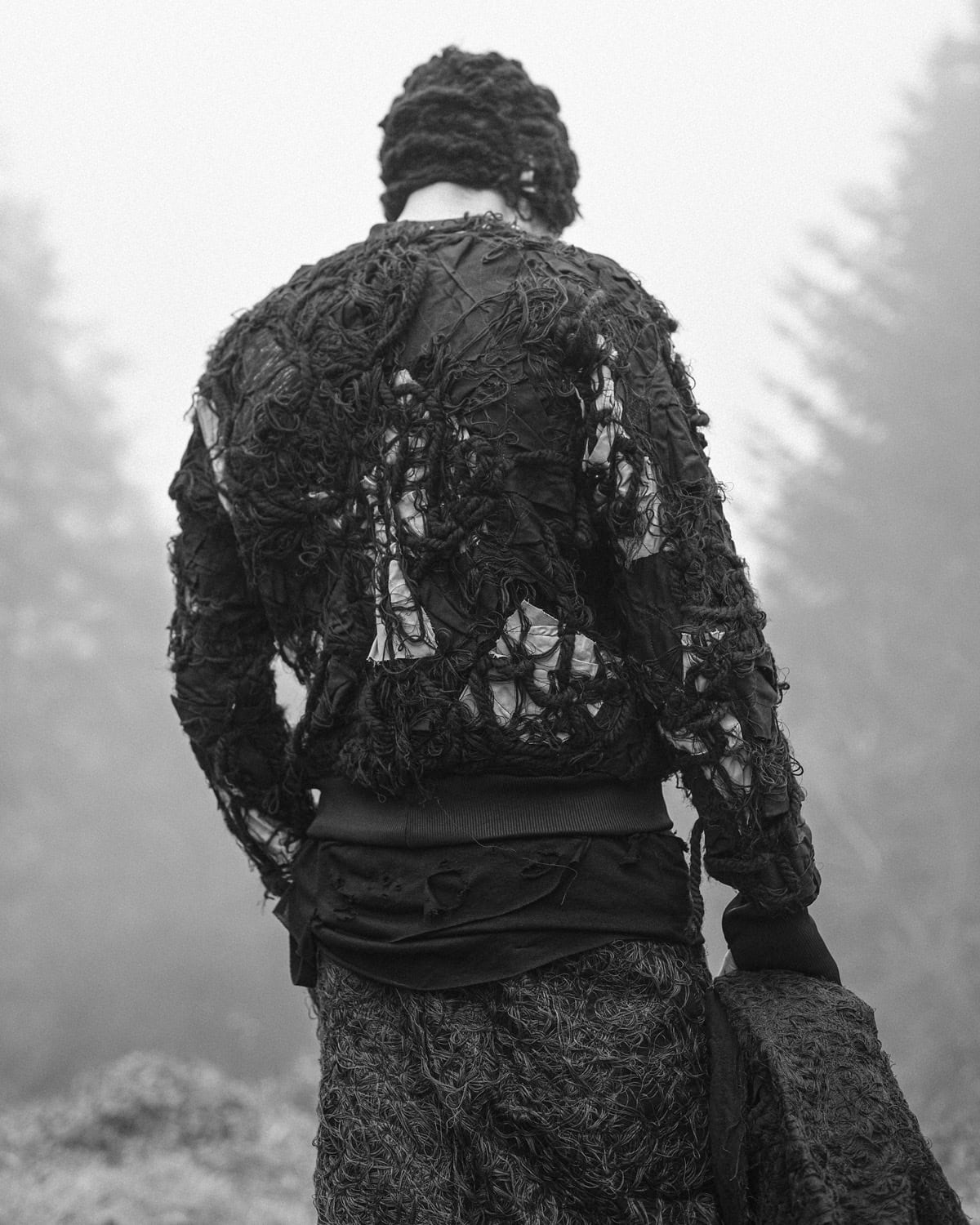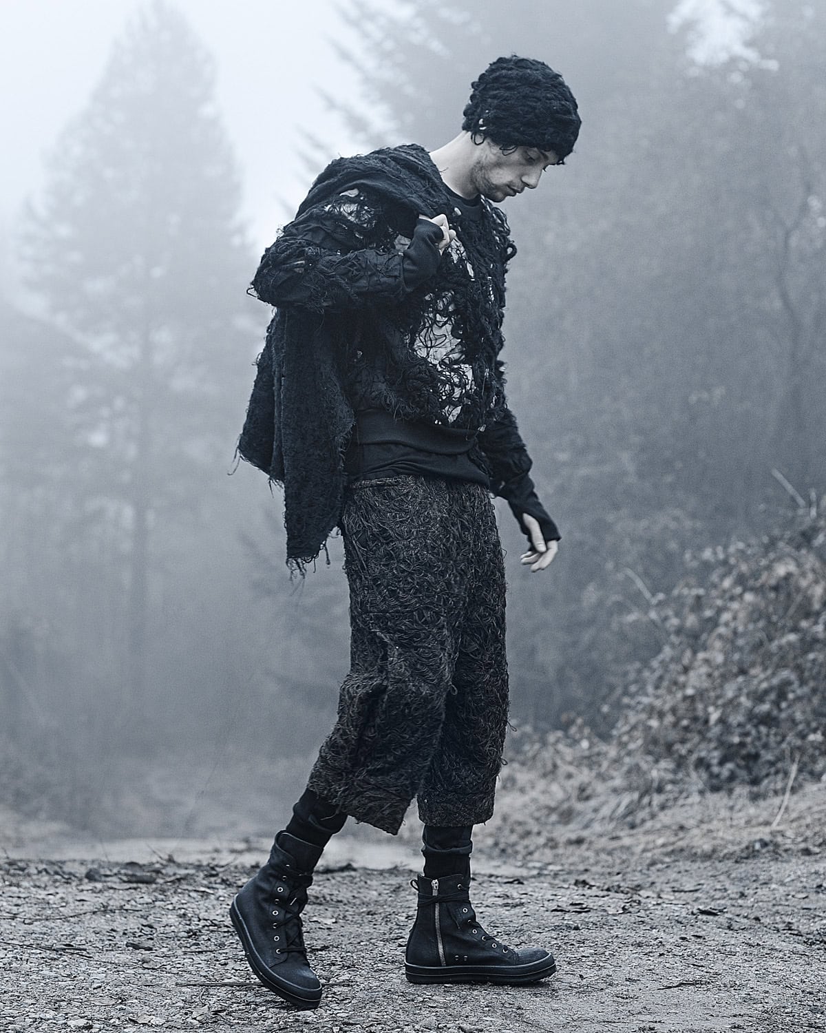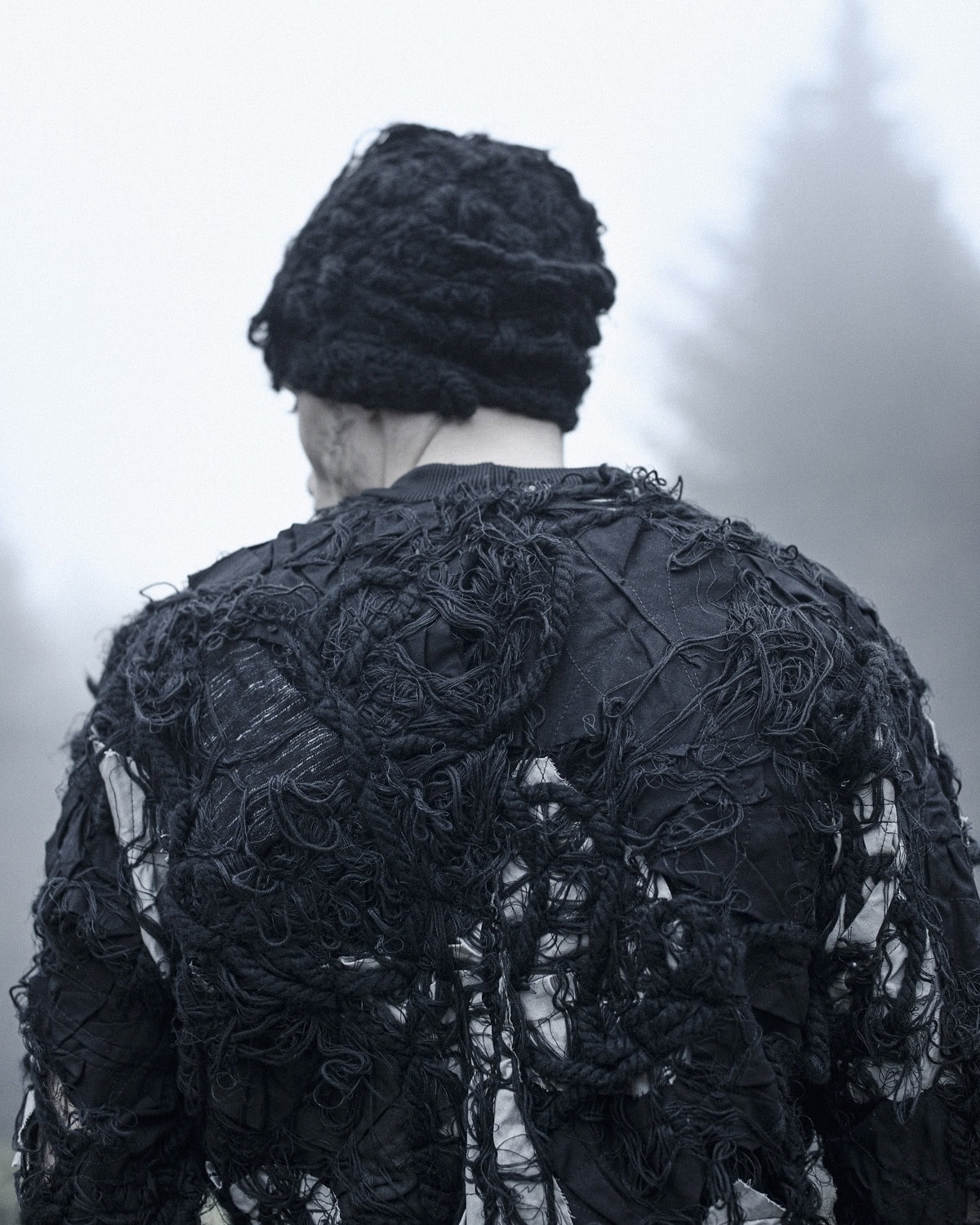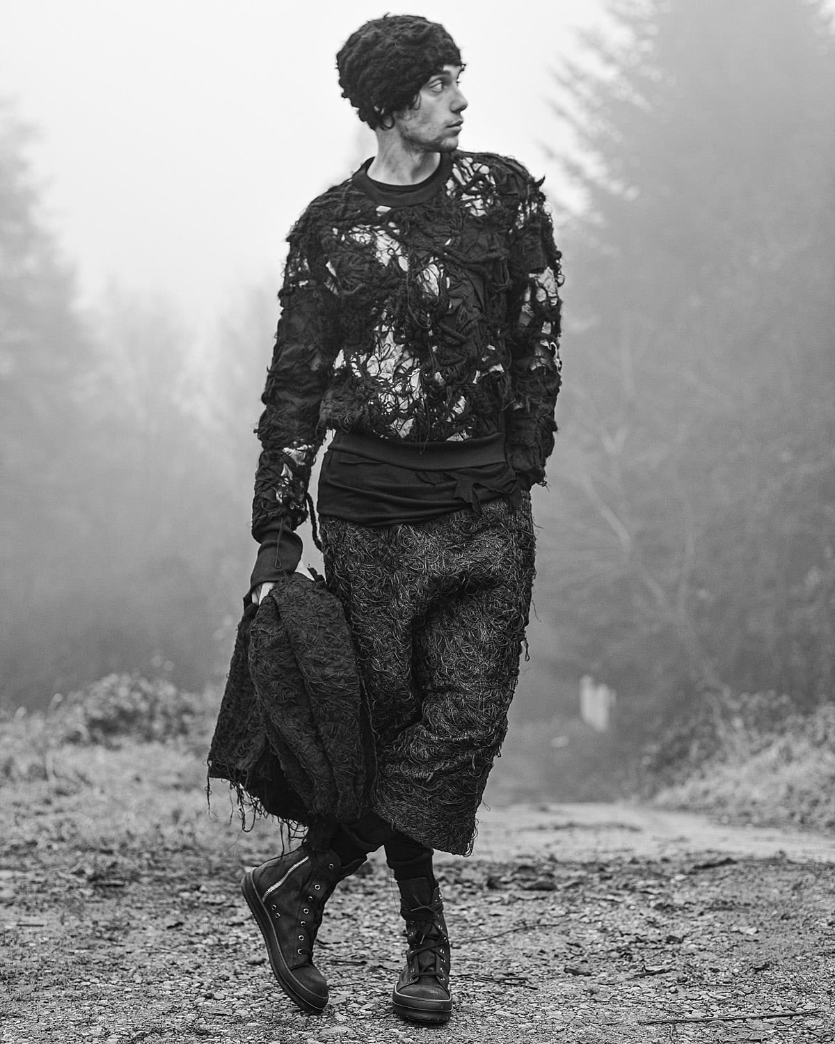 The total look is completed with the Black Fiber Bond Beanie Hat from collection ‘Spiral’. The beanie feels soft and warm to the skin due to the variety of wool and cotton fibers and yarns. These pictures aim to present a logical blend of the artisan Fiber Bond Technique in a unique and warm outfit in tune with the surroundings.