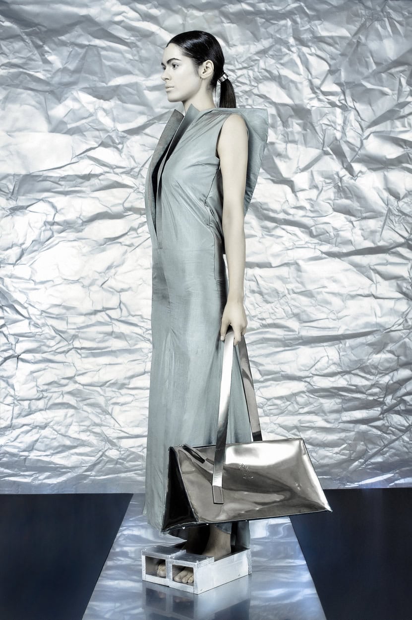 The natural finalization of this collection are the accessories crafted from genuine leather, based on the symbiosis between flat and architectural lines shaping this urban silk error.