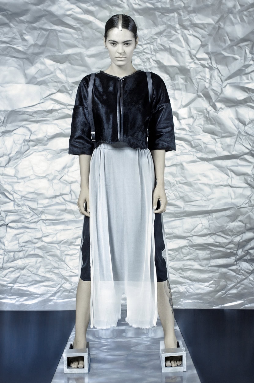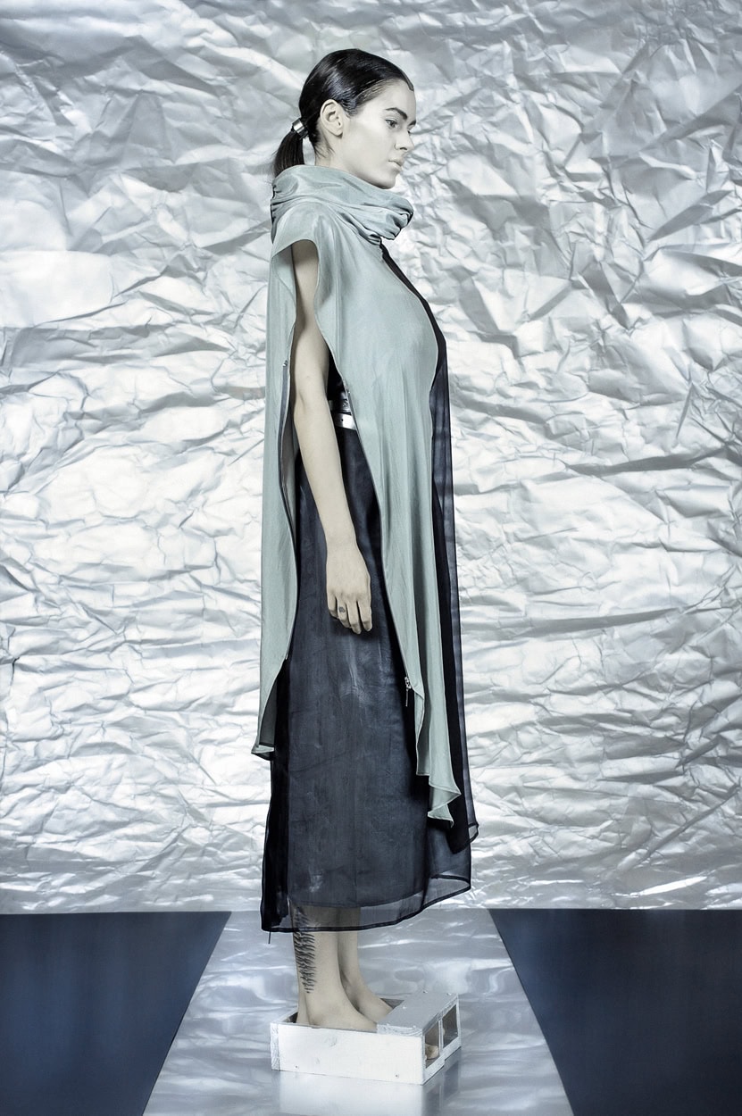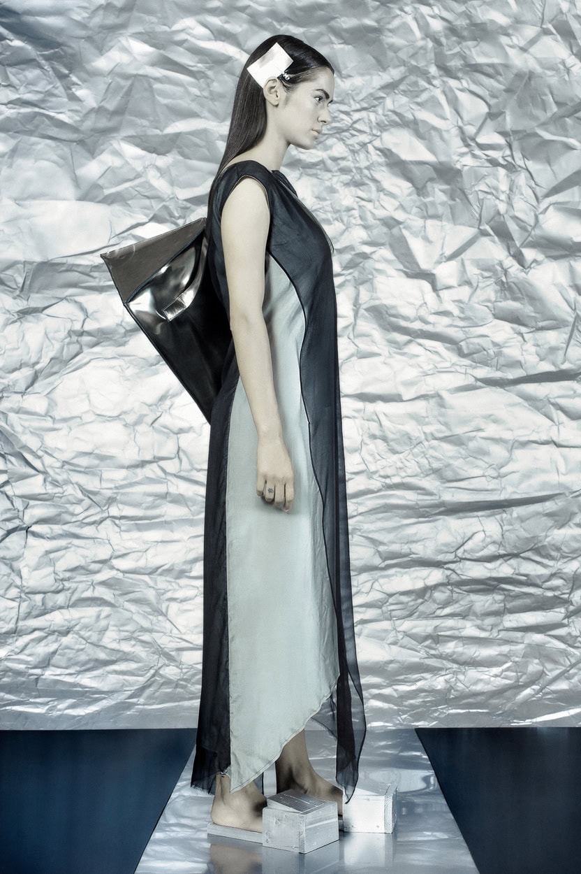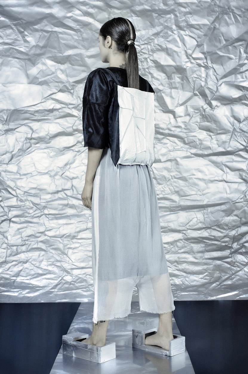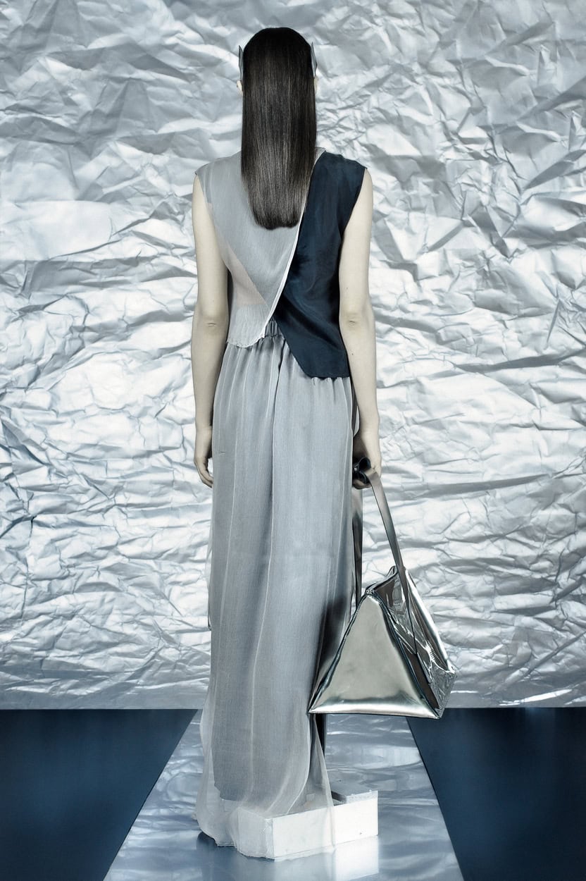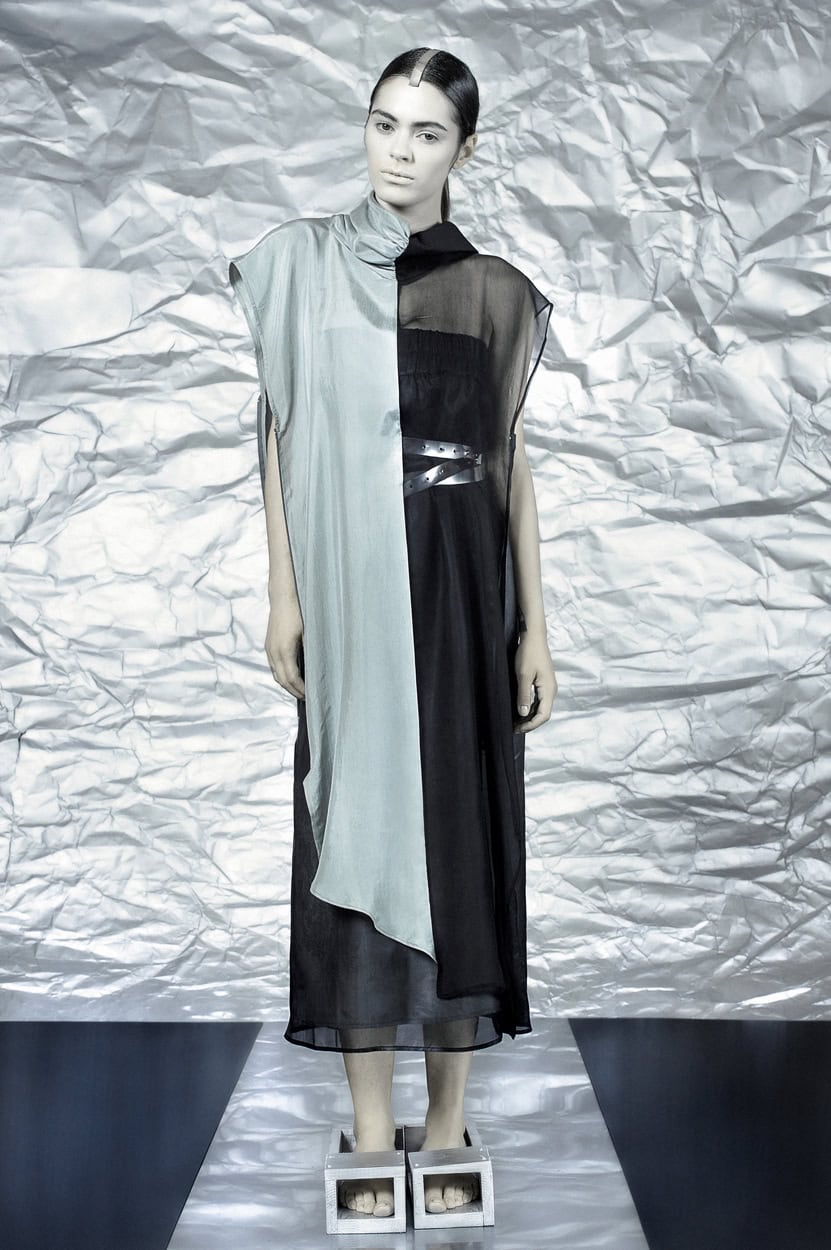 Concentrating on geometries as pure shape without color, the fashion silhouettes in this collection are transformed into objects dressed in the lights and shades of the achromatic gamma. This is how specific tonality is formed. The nuances in the chiaroscuro develop from soft white to deep grey and all the way to graphite black. Despite the static constructive line of the collection through draping garments progress into free falling forms.