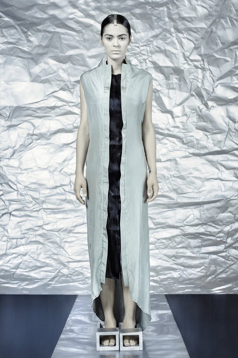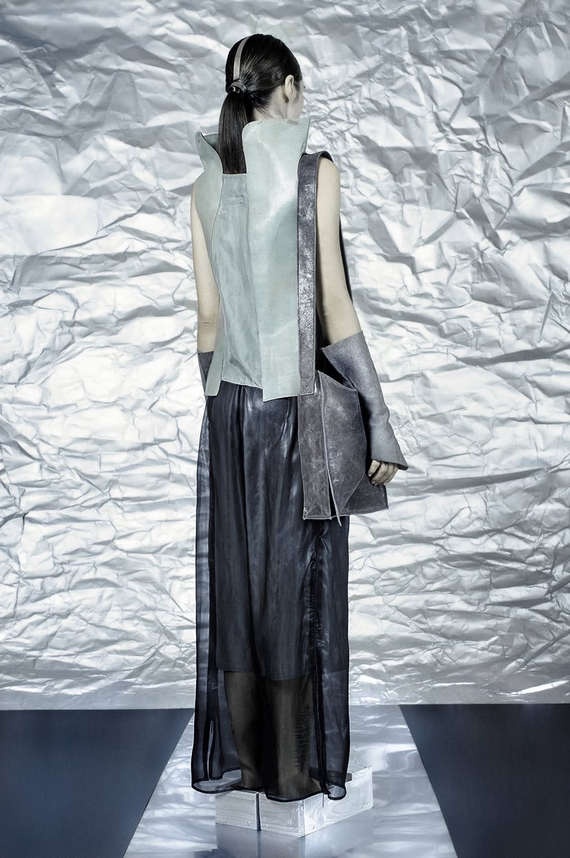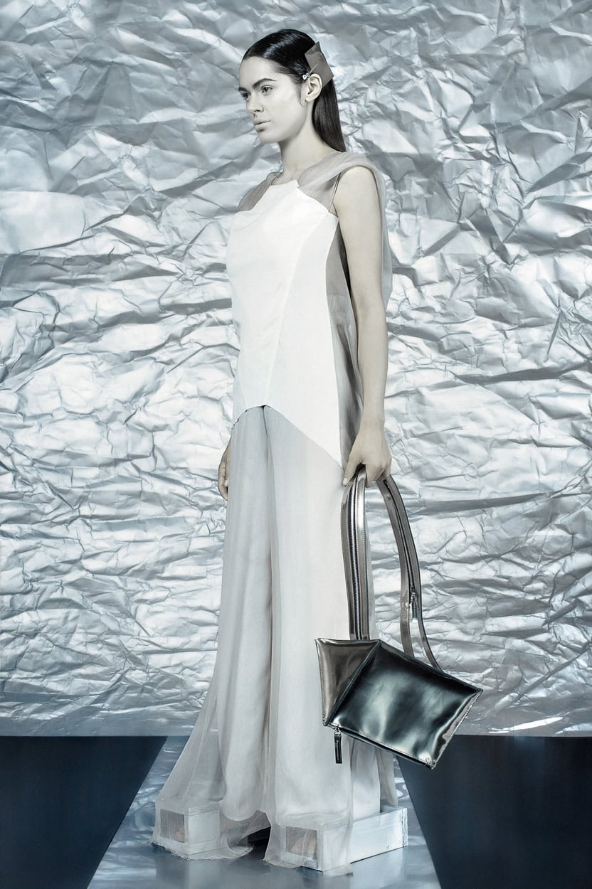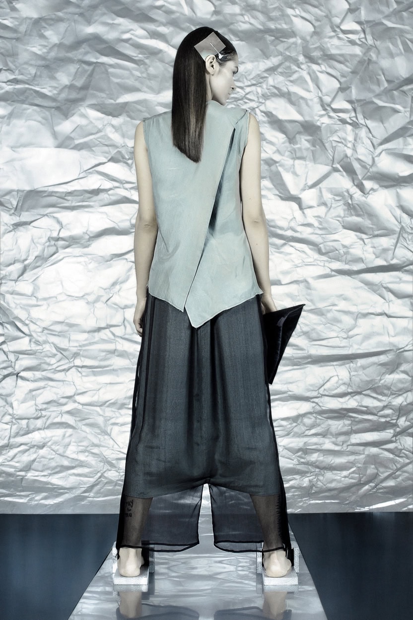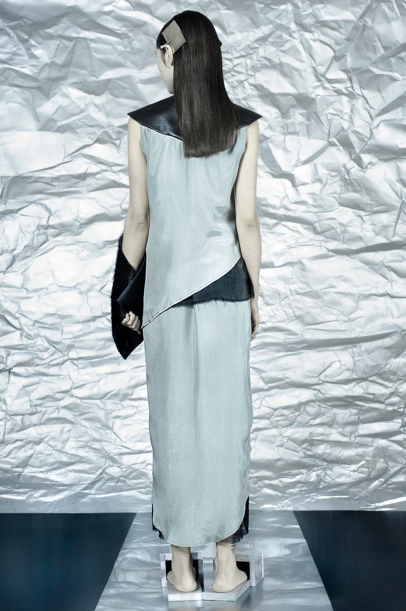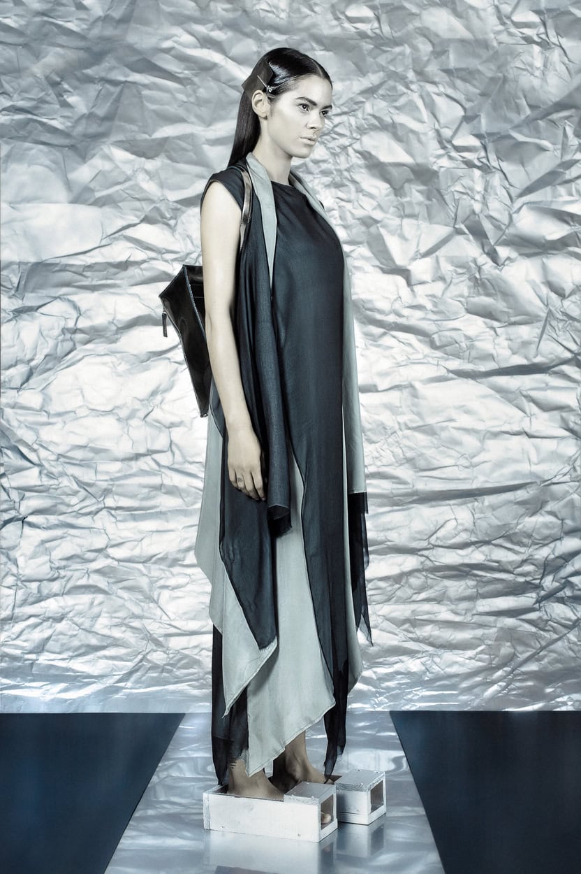 Concentrating on geometries as pure shape without color, the fashion silhouettes in this collection are transformed into objects dressed in the lights and shades of the achromatic gamma. This is how specific tonality is formed. The nuances in the chiaroscuro develop from soft white to deep grey and all the way to graphite black. Despite the static constructive line of the collection through draping garments progress into free falling forms.