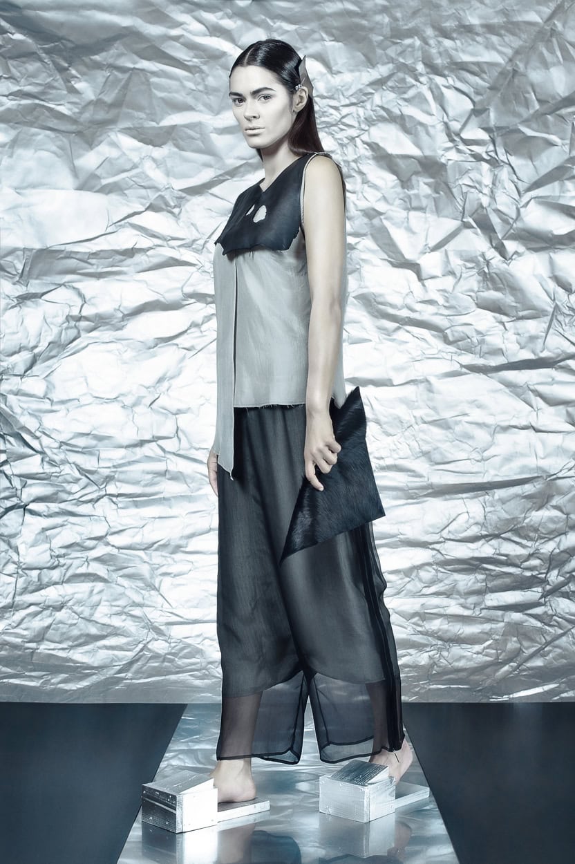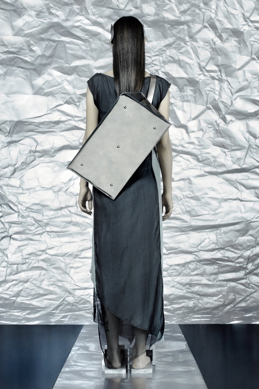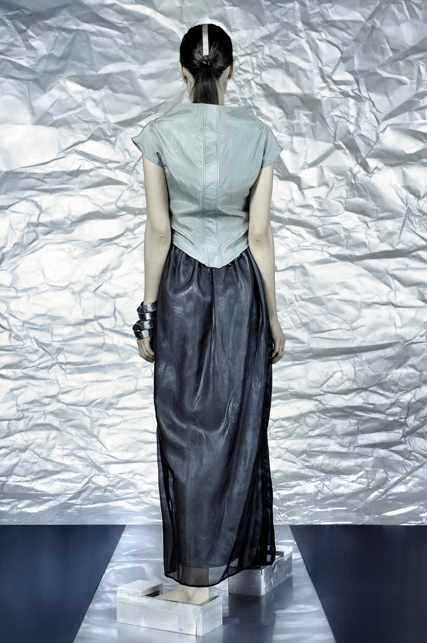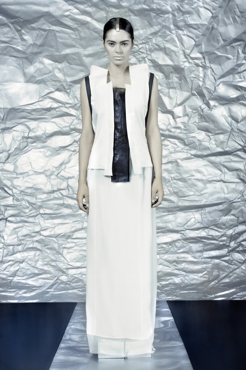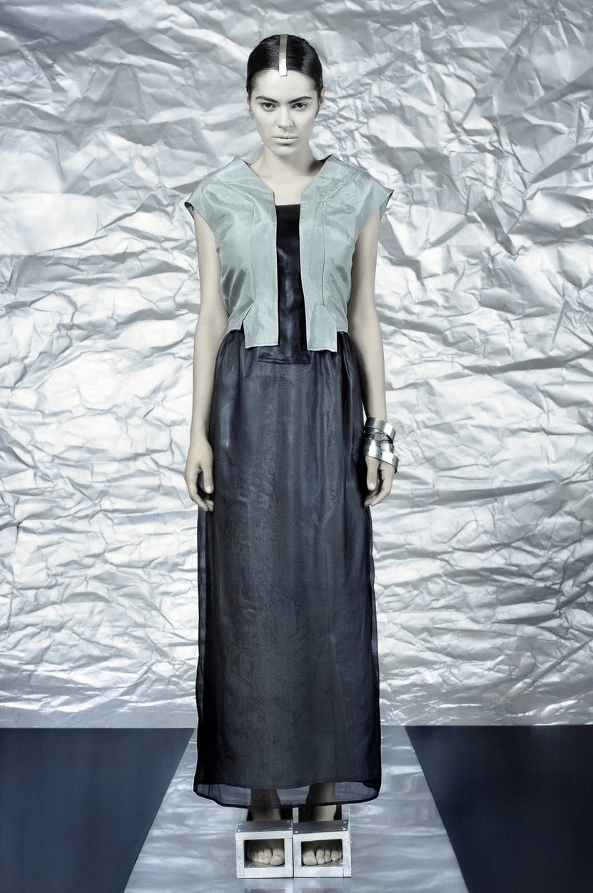 Concentrating on geometries as pure shape without color, the fashion silhouettes in this collection are transformed into objects dressed in the lights and shades of the achromatic gamma. This is how specific tonality is formed. The nuances in the chiaroscuro develop from soft white to deep grey and all the way to graphite black. Despite the static constructive line of the collection through draping garments progress into free falling forms.