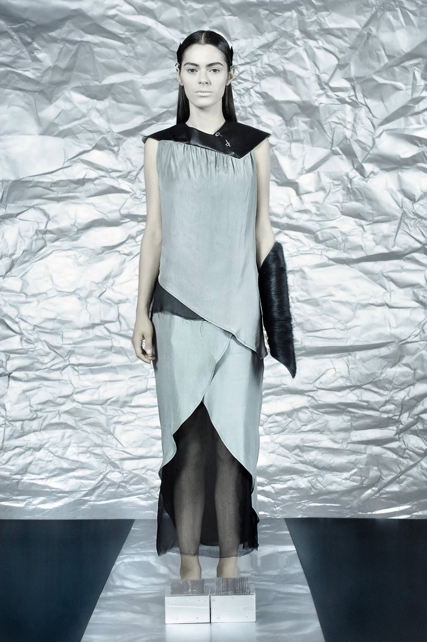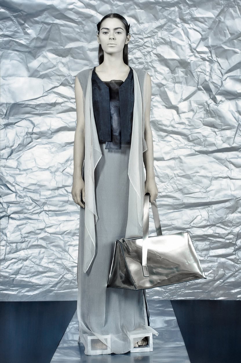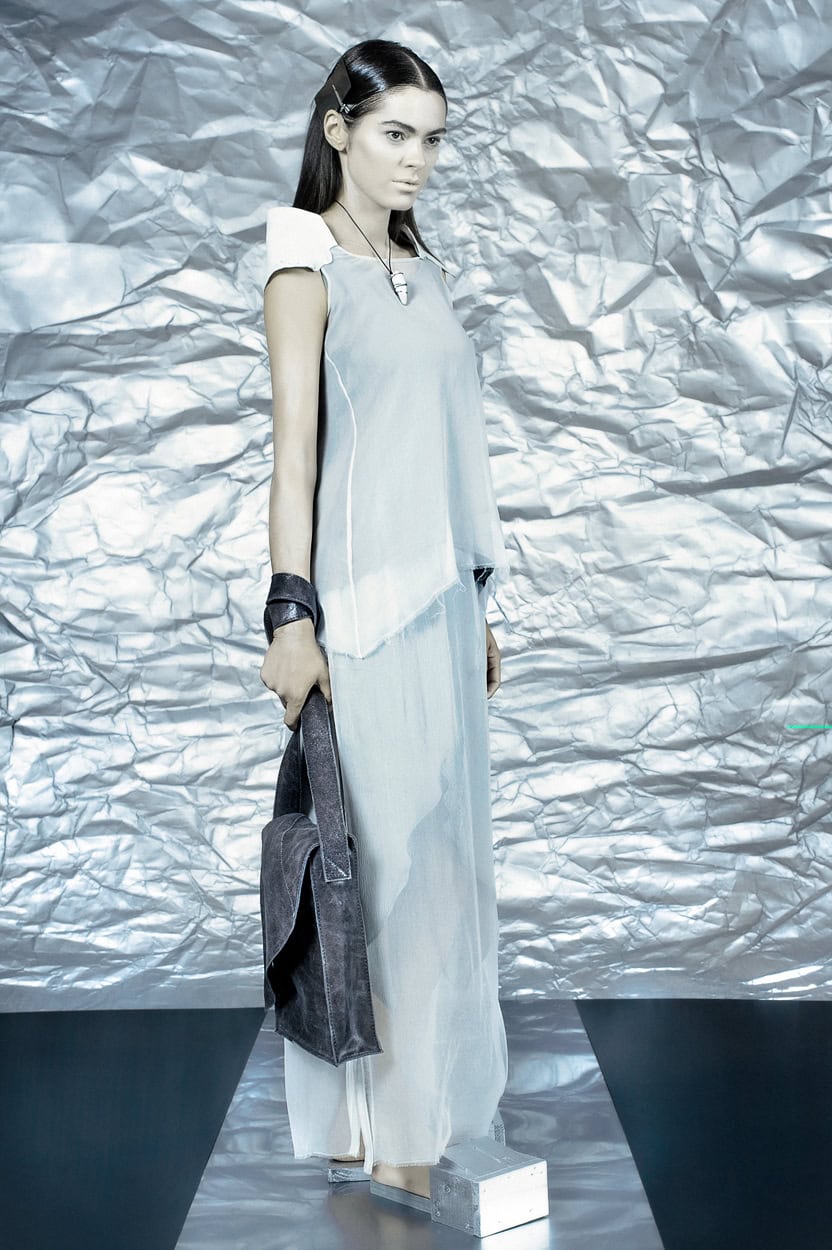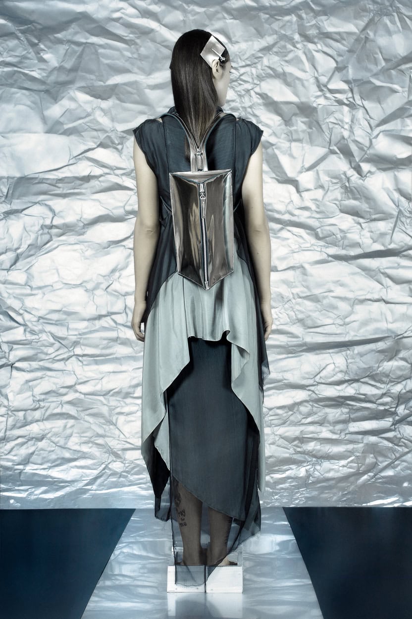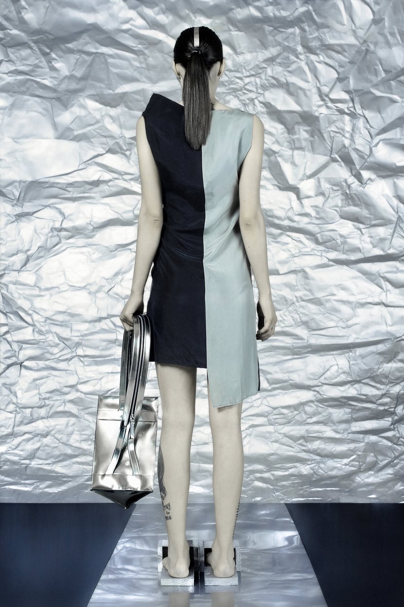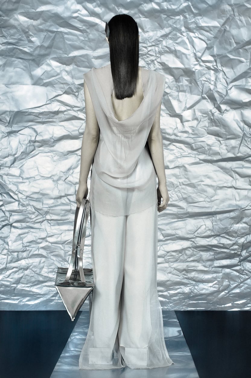 Concentrating on geometries as pure shape without color, the fashion silhouettes in this collection are transformed into objects dressed in the lights and shades of the achromatic gamma. This is how specific tonality is formed. The nuances in the chiaroscuro develop from soft white to deep grey and all the way to graphite black. Despite the static constructive line of the collection through draping garments progress into free falling forms.