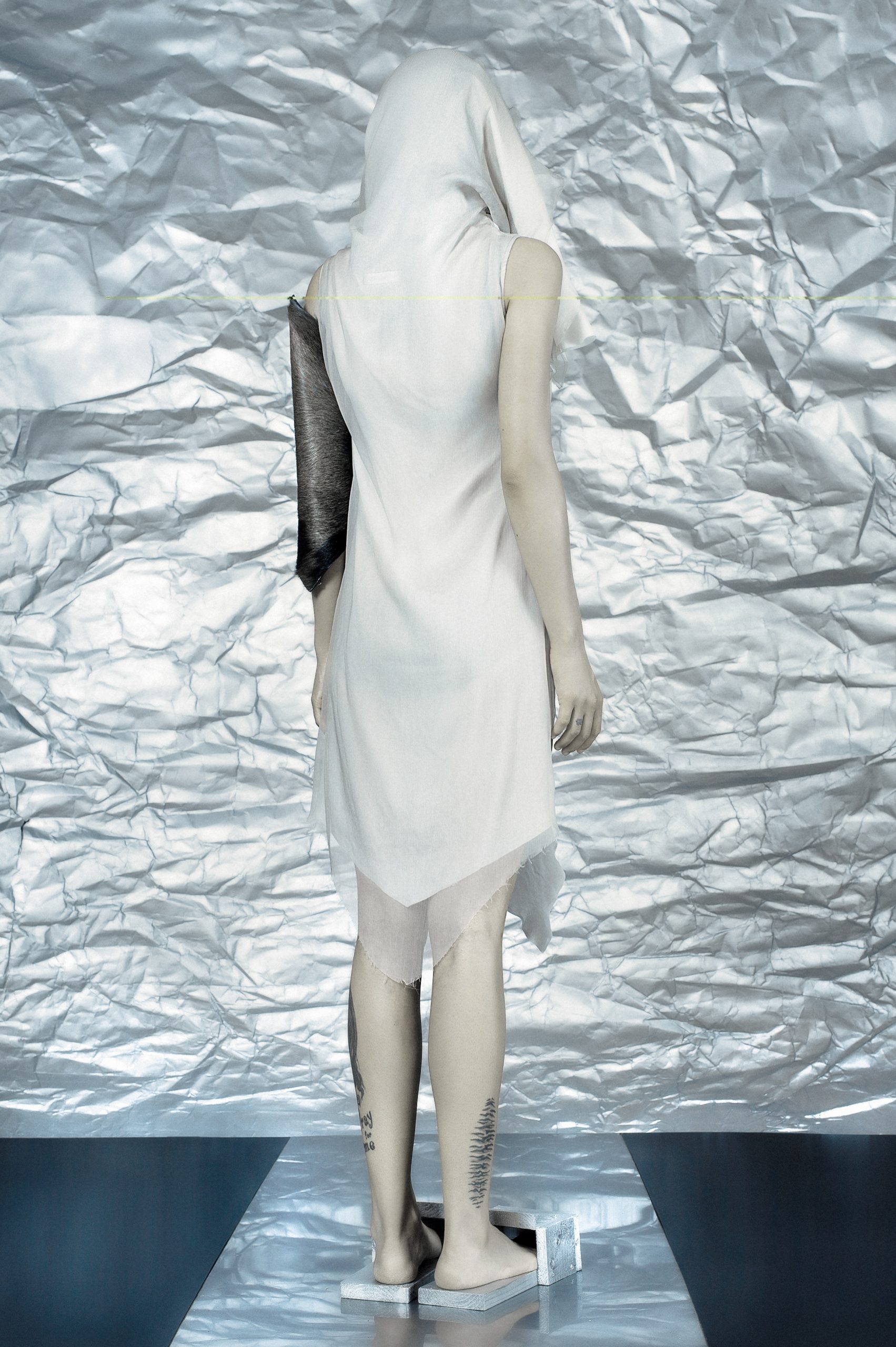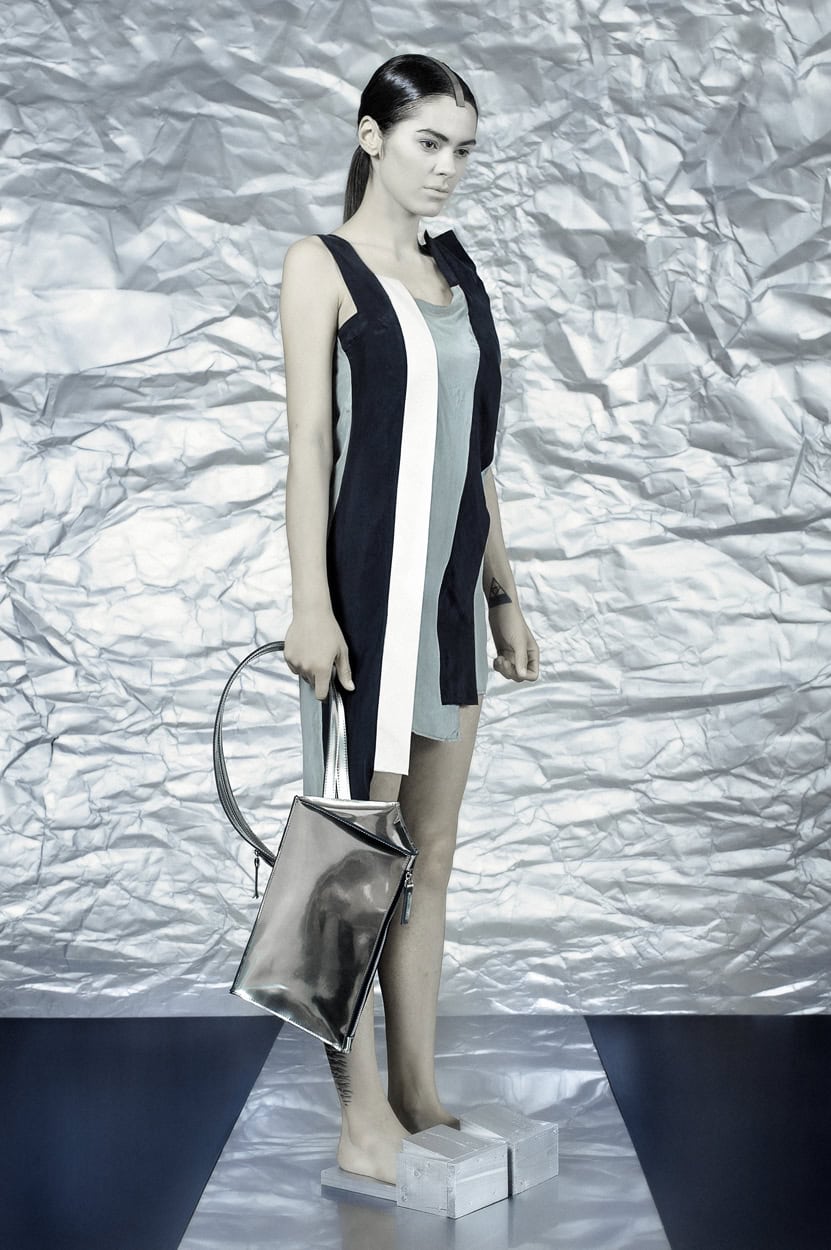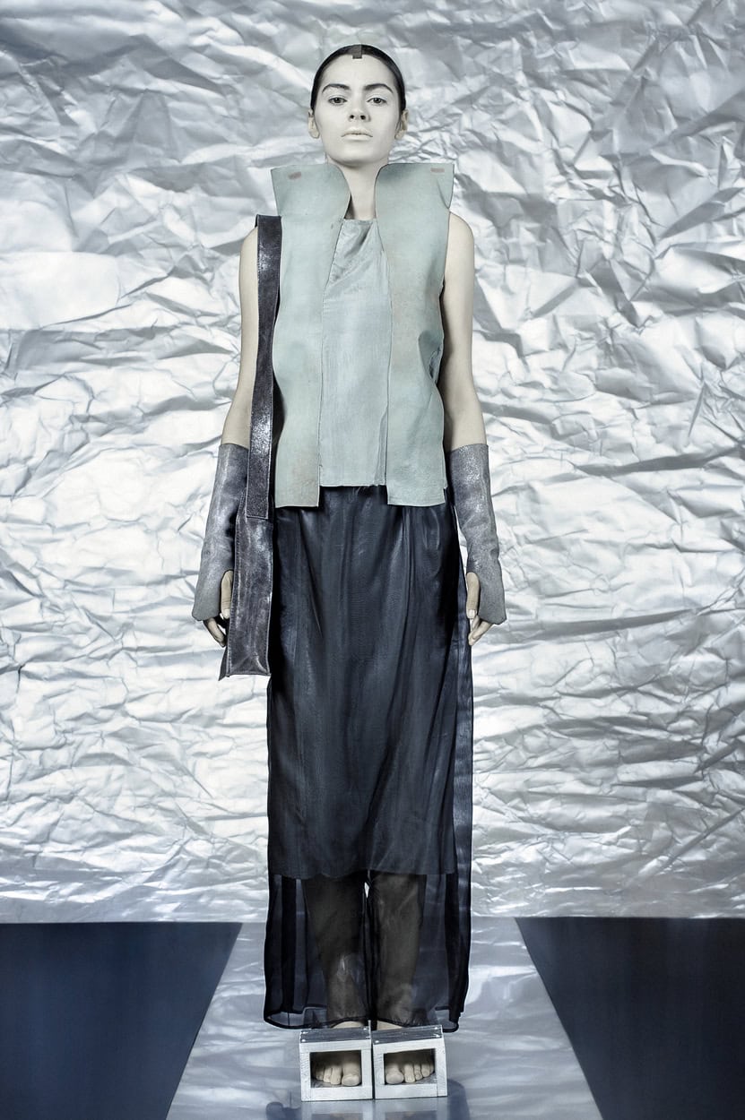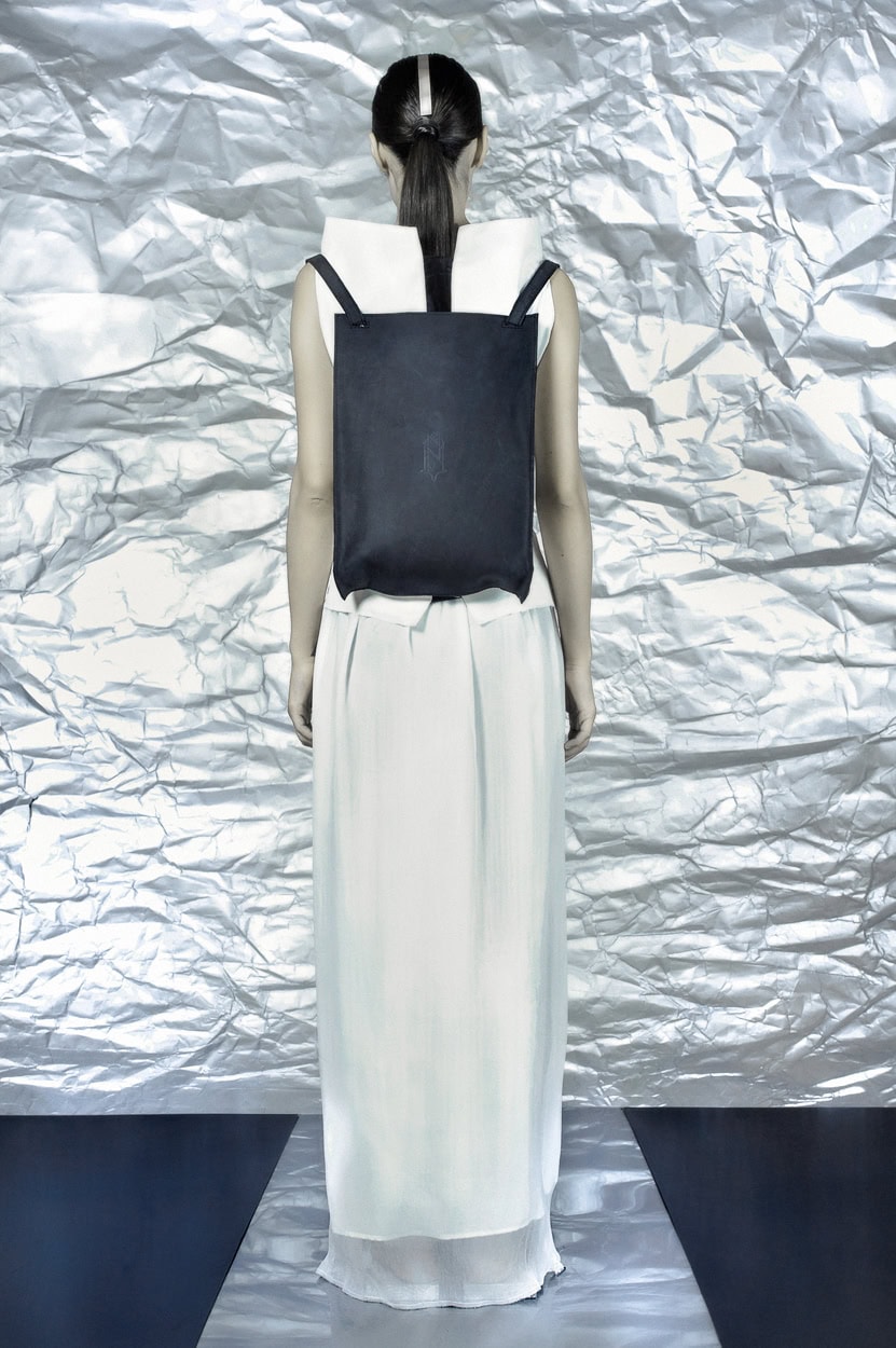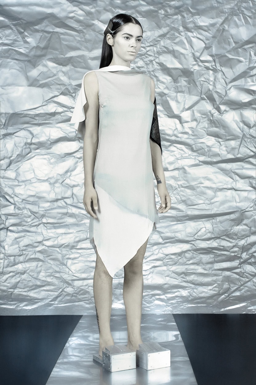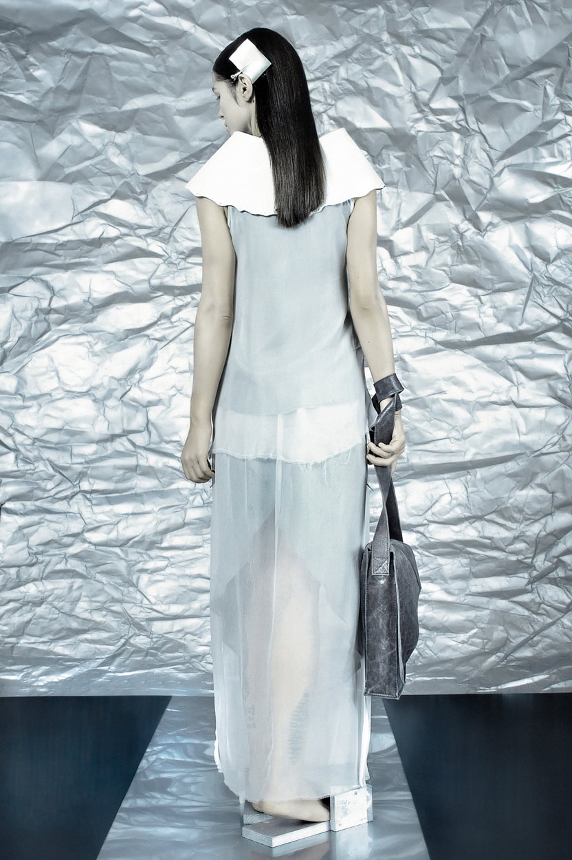 Concentrating on geometries as pure shape without color, the fashion silhouettes in this collection are transformed into objects dressed in the lights and shades of the achromatic gamma. This is how specific tonality is formed. The nuances in the chiaroscuro develop from soft white to deep grey and all the way to graphite black. Despite the static constructive line of the collection through draping garments progress into free falling forms.
